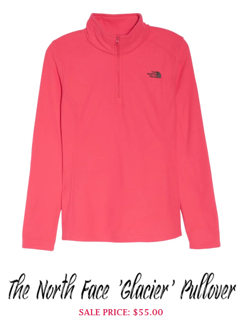 This North Face ‘Glacier’ Pullover is a Quarter Zip Fleece and to me a no brainer for Winter Weather! I love the Atomic Pink Color. It comes in an Electric Orange as well however this Pink is just so ‘lady like’ and pretty. I believe $55 for this new arrival is also a great price point.
